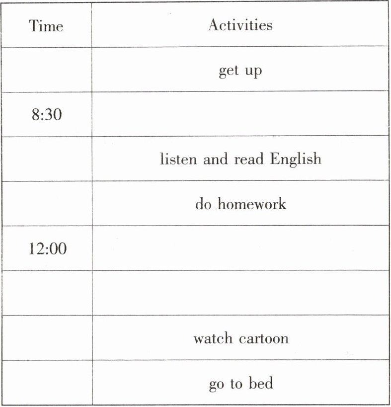 答案: 7:00;have breakfast;9:00;10:00;have lunch;14:00(take a nap);15:00(free activity);19:00;21:00 。