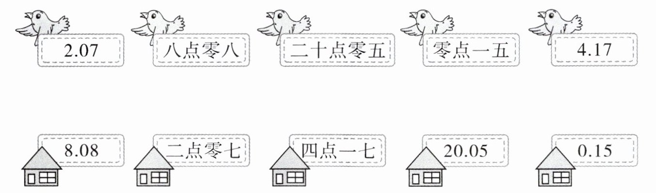 【解析】:根据小数的读写规则,将文字表述的小数与对应的数字形式进行连线。“八点零八”写作$8.08$,“二十点零五”写作$20.05$,“零点一五”写作$0.15$,“二点零七”写作$2.07$,“四点一七”写作$4.17$。
