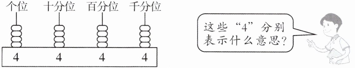 【答案】:个位上的$4$表示$4$个一;十分位上的$4$表示$4$个$0.1$;百分位上的$4$表示$4$个$0.01$;千分位上的$4$表示$4$个$0.001$。