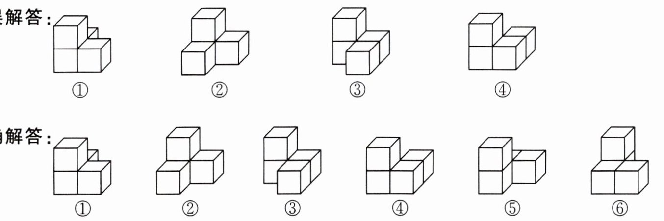 然后将剩下的一个小正方体添加进去,从而忽略了这三个小正方体不在同一排的情况。正确的摆法应是考虑摆上下两层,下层摆三个小正方体,上层摆一个。其中下层可以有四种摆法,上层的一个小正方体一定摆在左边一列。如果考虑小正方体和另外一个小正方体只共用一条棱的情况,是不是会有更多摆法呢? 想想看。