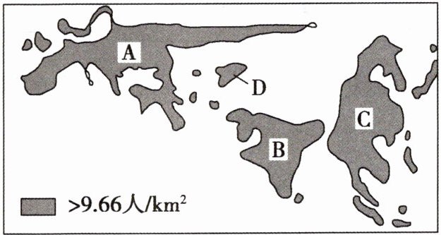 为了揭示世界人口的分布状况,著名学者邦奇等创建了人类大陆图,即在地图上取消陆地和海洋,仅画出人类密集的地区,面积较大的人类密集区称为人类大陆。世界上共存在四个人类大陆:第一个为东亚和东南亚;第二个是南亚;第三个是欧洲;第四个是北美洲东部。下图为人类大陆图的一部分。读图,回答5、6题。