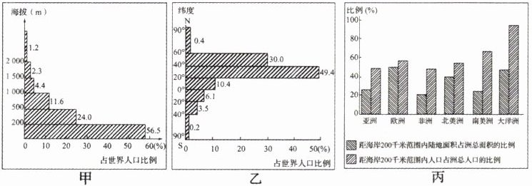 2.图乙中人口占世界人口比例最小的纬度带,其人口分布少的主要原因是(