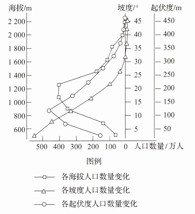 人口分布受地形因子(海拔、坡度和起伏度等)的影响较大。下图为贵州省乌江流域人口数量变化示意图。据此完成3、4题。