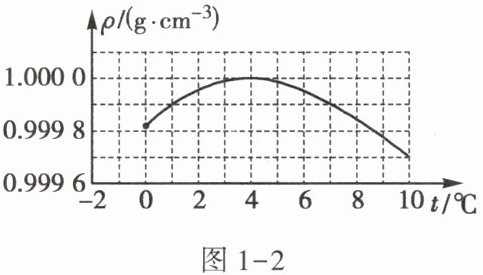 3. 水具有反常膨胀的特性。如图1-2所示为水的密度在0~10℃范围内随温度变化的曲线。根据图像可知,温度等于____℃时,水的密度最大;0~4℃,水具有____(选填“热胀冷缩”或“热缩冷胀”)的性质。水的反常膨胀特性,保证了湖底的水温始终保持在____℃左右,保护了水底生物。