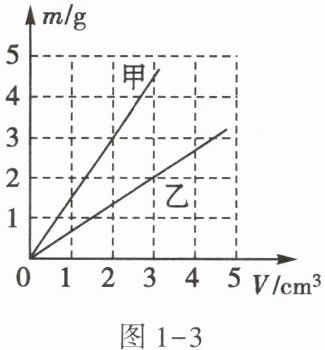 4. 甲、乙两种物质的质量与体积的关系图像如图1-3所示。由图可知,密度较大的是____(选填“甲”或“乙”),甲的密度是____g/cm³。