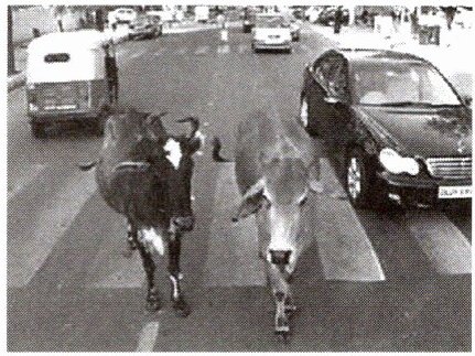 牛和田野在一起是一幅农耕图,牛和汽车挤在公路上则让人有奇妙的感觉,但这种景观在印度大小城市都能见到。牛在印度文化中象征着富饶和仁慈,牛可以拉车、犁地,牛粪晒干后可当燃料和肥料,牛奶是印度人的主要食物。这一切让许多