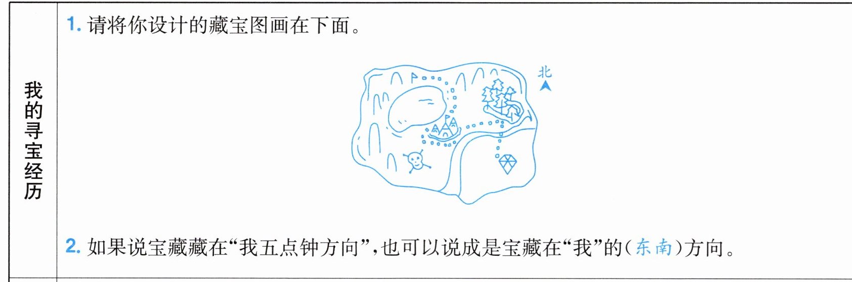 1 准备一幅藏宝图,仔细观察藏宝图,用含有方位的语言描述如何进入宝藏所在的位置来寻找宝藏。