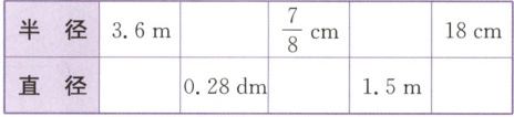 2.半径3.6m 0.14dm $\frac{7}{8}$cm 0.75m 18cm