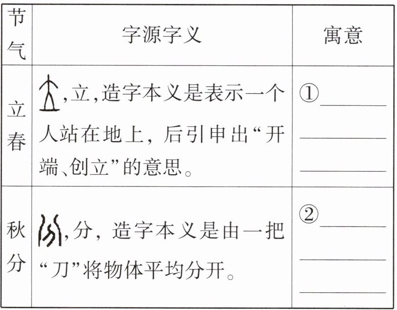 | 秋分 | ,分,造字本义是由一把“刀”将物体平均分开。 | ②______ |