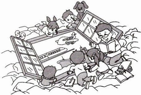 (1)这幅插图中老师正在给同学们讲知识,同学们一边听,一边看向打开的窗户,窗户外是飞机、高铁、轮船等,(2分)图片巧妙地表现了以张锦文为代表的乡村教师用自己的敬业精神和奉献精神,为孩子们打开了一扇了解世界的窗户。(2分)