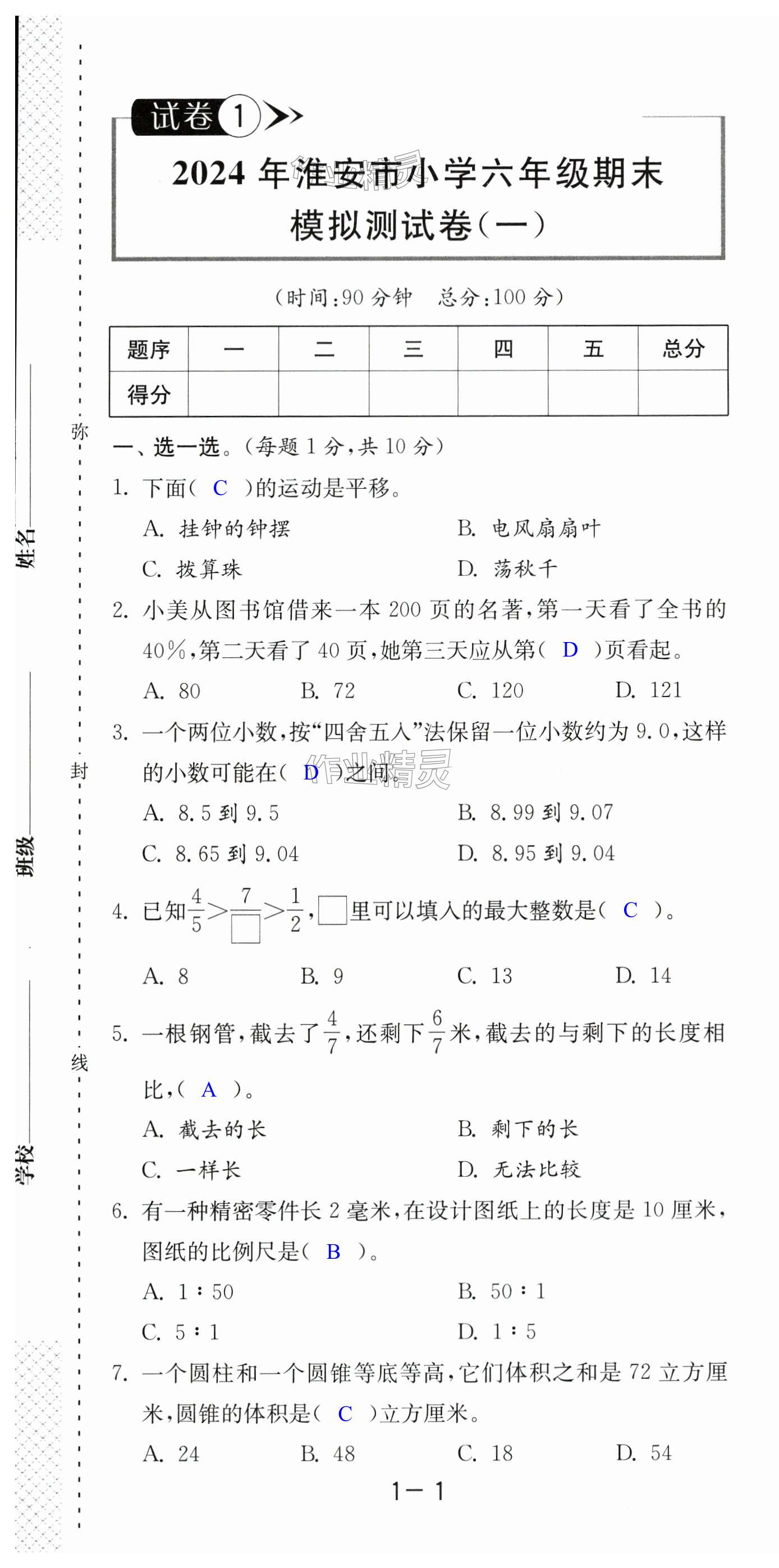 注:目前有些书本章节名称可能整理的还不是很完善,但都是按照顺序排列的,请同学们按照顺序仔细查找。练习册 2024年考必胜小学毕业升学考试试卷精选六年级数学淮安专版 答案主要是用来给同学们做完题方便对答案用的,请勿直接抄袭。