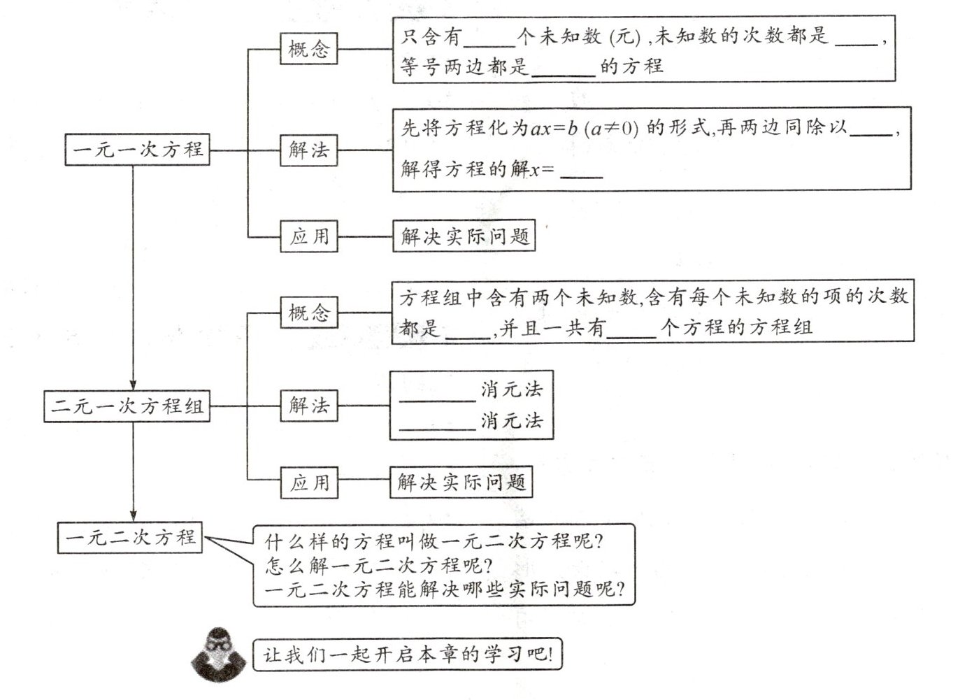 一元一次方程 概念:1. 一 2. 1 3. 整式 解法:$1. a 2. \frac{b}{a} $二元一次方程组 概念:1. 1 2. 两 解法:1. 代入 2. 加减