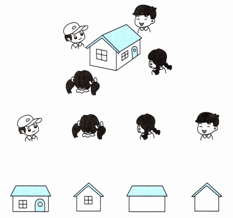 4. 四位小朋友看到的分别是哪一幅图?连一连。