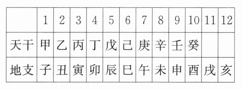 7. 干支纪年法是中国历法上自古以来就一直使用的纪年方法,干支是天干和地支的总称,“甲、乙、丙、丁、戊、己、庚、辛、壬、癸”十个符号叫天干;“子、丑、寅、卯、辰、巳、午、未、申、酉、戌、亥”十二个符号叫地支. 把干支(天干+地支)顺序相配(甲子、乙丑、丙寅…)正好六十为一周期,周而复始,循环记录,这就是俗称的“干支表”.