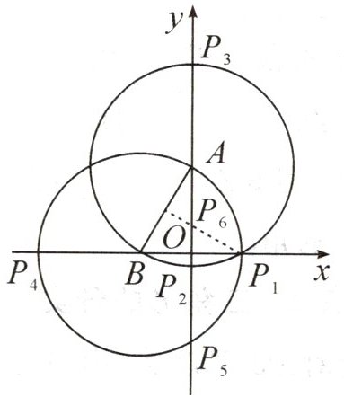 ③ 当$AP = BP$时,画线段$AB$的垂直平分线,与$x$轴有一个交点$P_{1}$(与①中重合),与$y$轴有一个交点$P_{6}$。