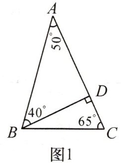 1. 等腰三角形一腰上的高与另一腰的夹角为$40^{\circ}$,则它的底角为$\underline{65^{\circ}}$。 更正:$65^{\circ}$或$25^{\circ}$