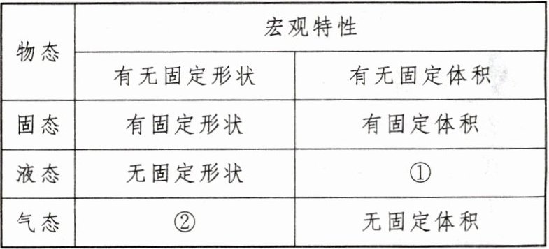 1. 下表归纳了固、液、气三态物质的某些宏观特性,表格中①②处应分别填写(