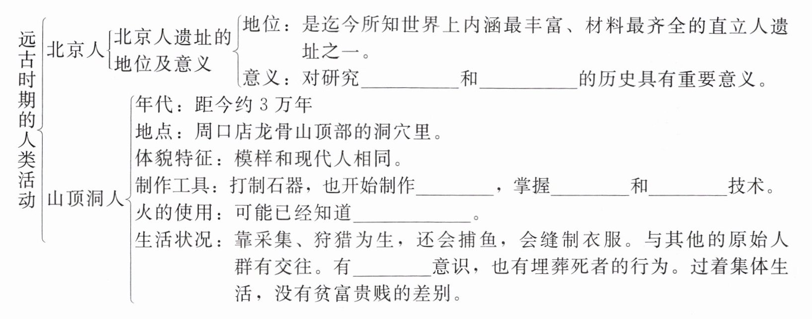 F --> F6[生活状况:靠采集、狩猎为生,还会捕鱼,会缝制衣服。与其他的原始人群有交往。有______意识,也有埋葬死者的行为。过着集体生活,没有贫富贵贱的差别。]