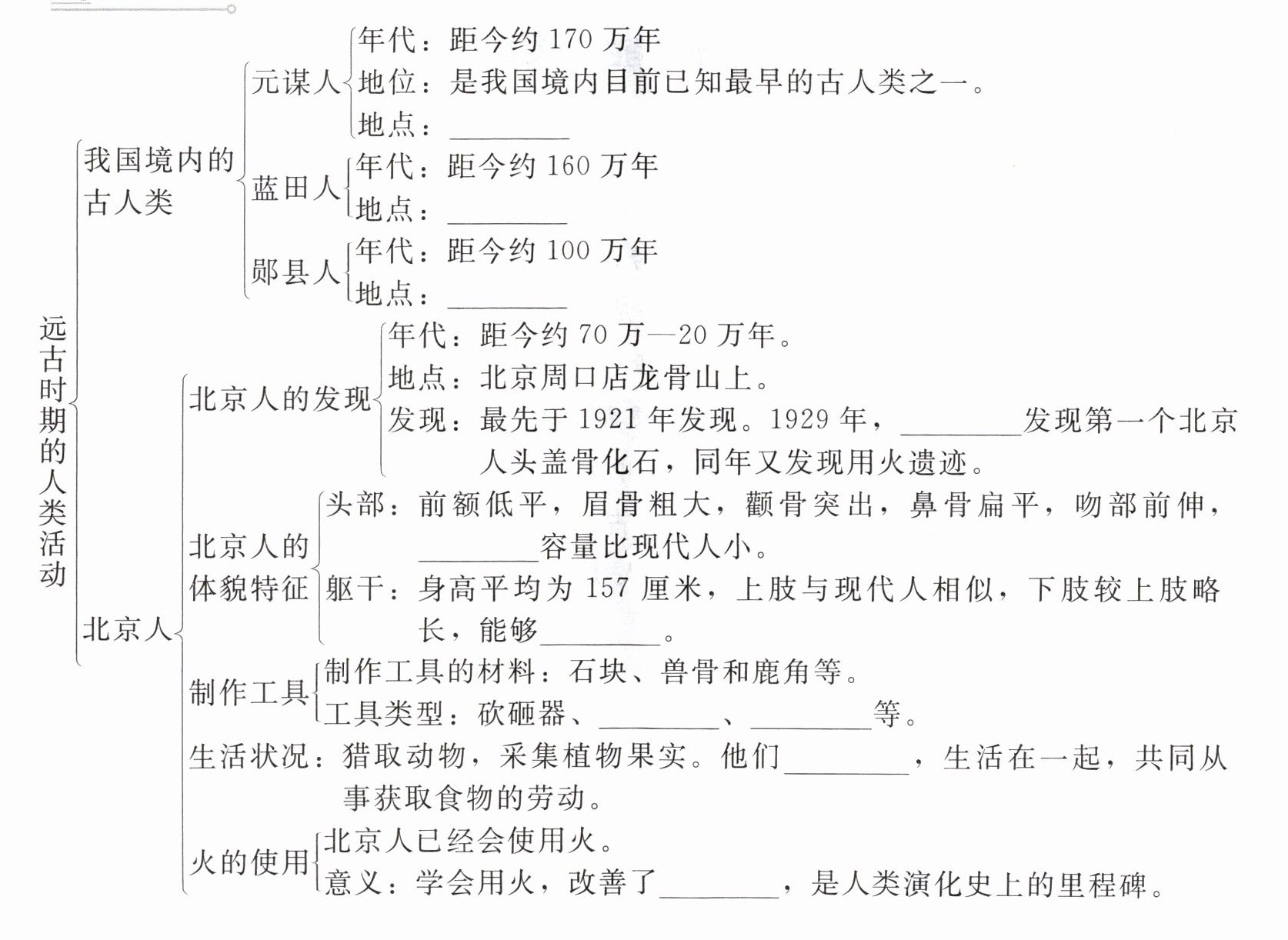 云南元谋 陕西蓝田 湖北郧阳 裴文中 脑 直立行走 尖状器 刮削器 结成群体 生存条件 人类起源 古人类演化 骨器 磨光 钻孔 人工取火 爱美