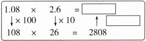 1. 下面是丽丽在计算$1.08×2.6$时的思考过程,请你补充完整。