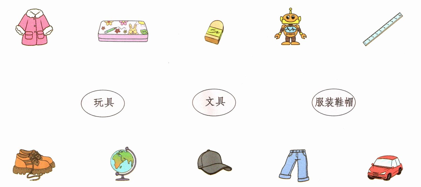玩具连机器人、玩具车;文具连文具盒、橡皮、尺子、地球仪;服装鞋帽连外套、鞋子、帽子、裤子)