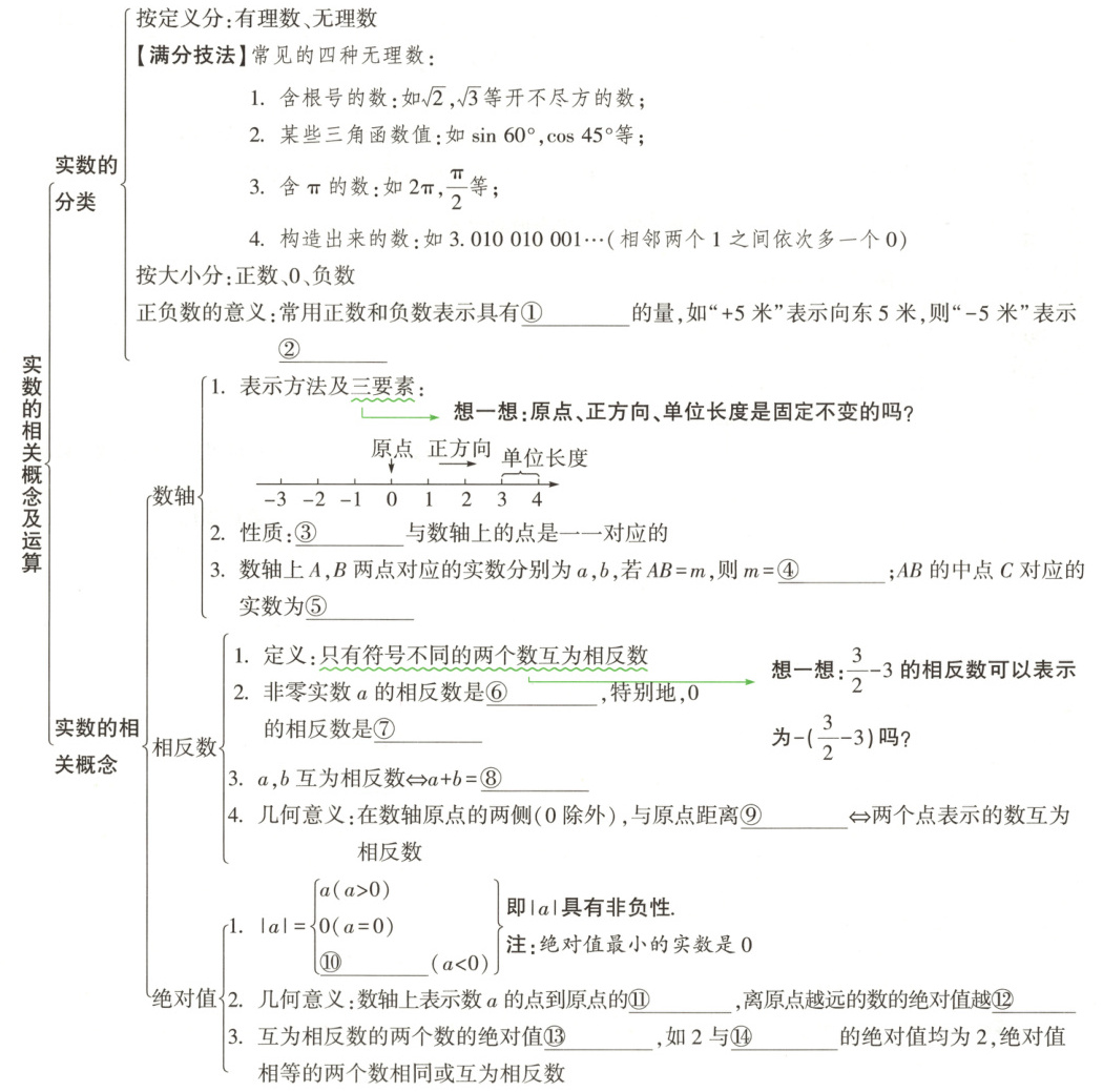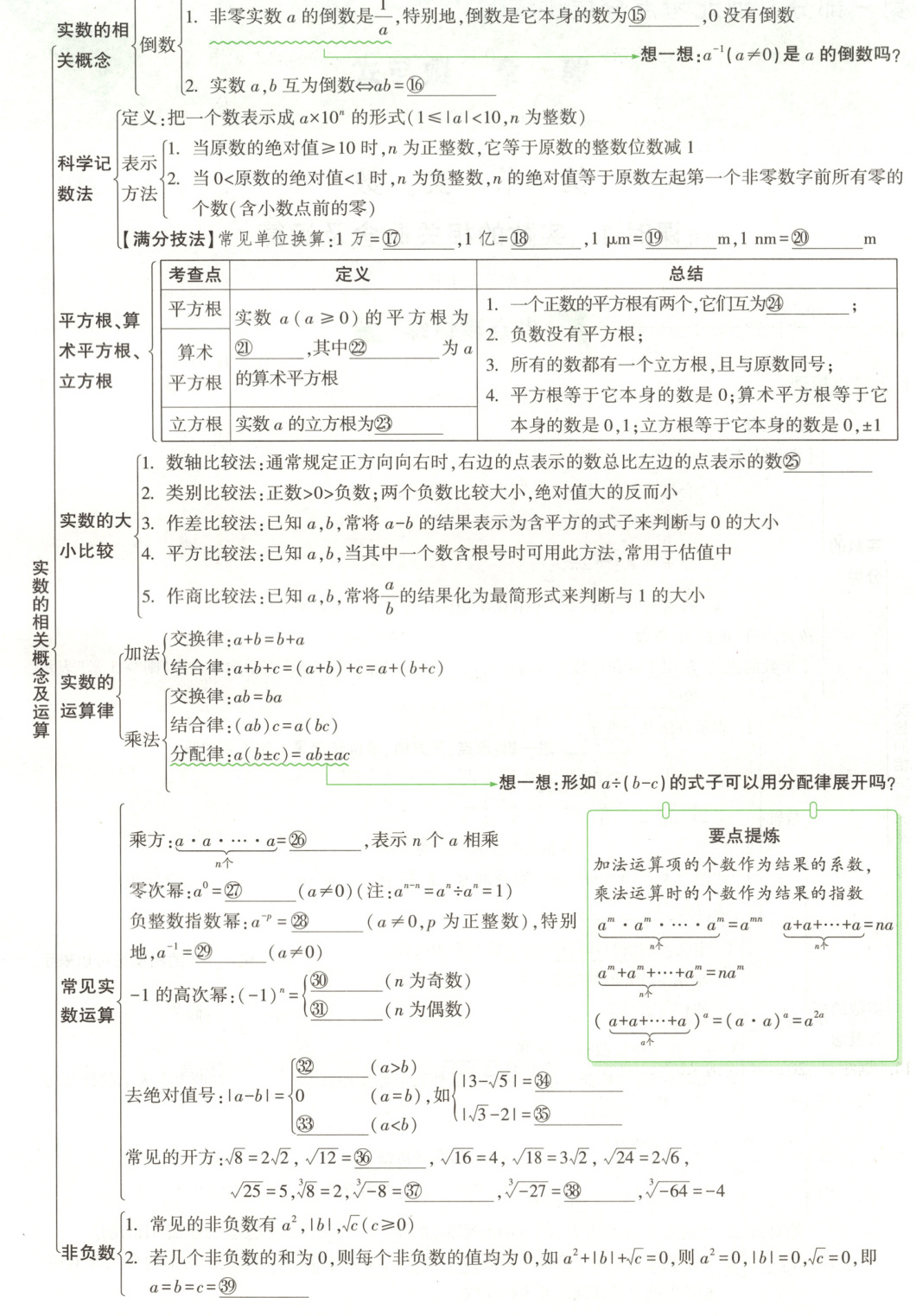 【解析】:根据实数相关概念及运算的定义和性质依次填空:正负数表示相反意义的量;数轴与实数一一对应,两点距离为绝对值差,中点为坐标平均;相反数是符号相反,和为0,距离原点相等;绝对值是距离,越远越大,相反数绝对值相等;倒数为1/a,本身倒数是±1;科学记数法单位换算按进率;平方根、立方根性质;运算律及幂运算规则等。