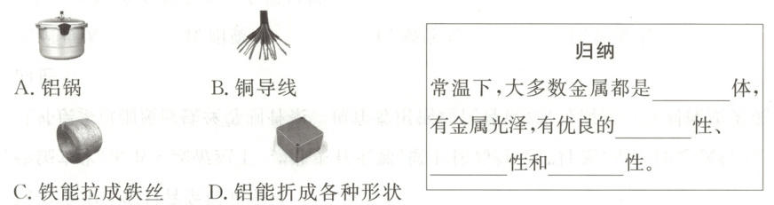 下图中展示了金属共同的物理性质,图A具有________性,图B具有________性,图C和图D具有________性。