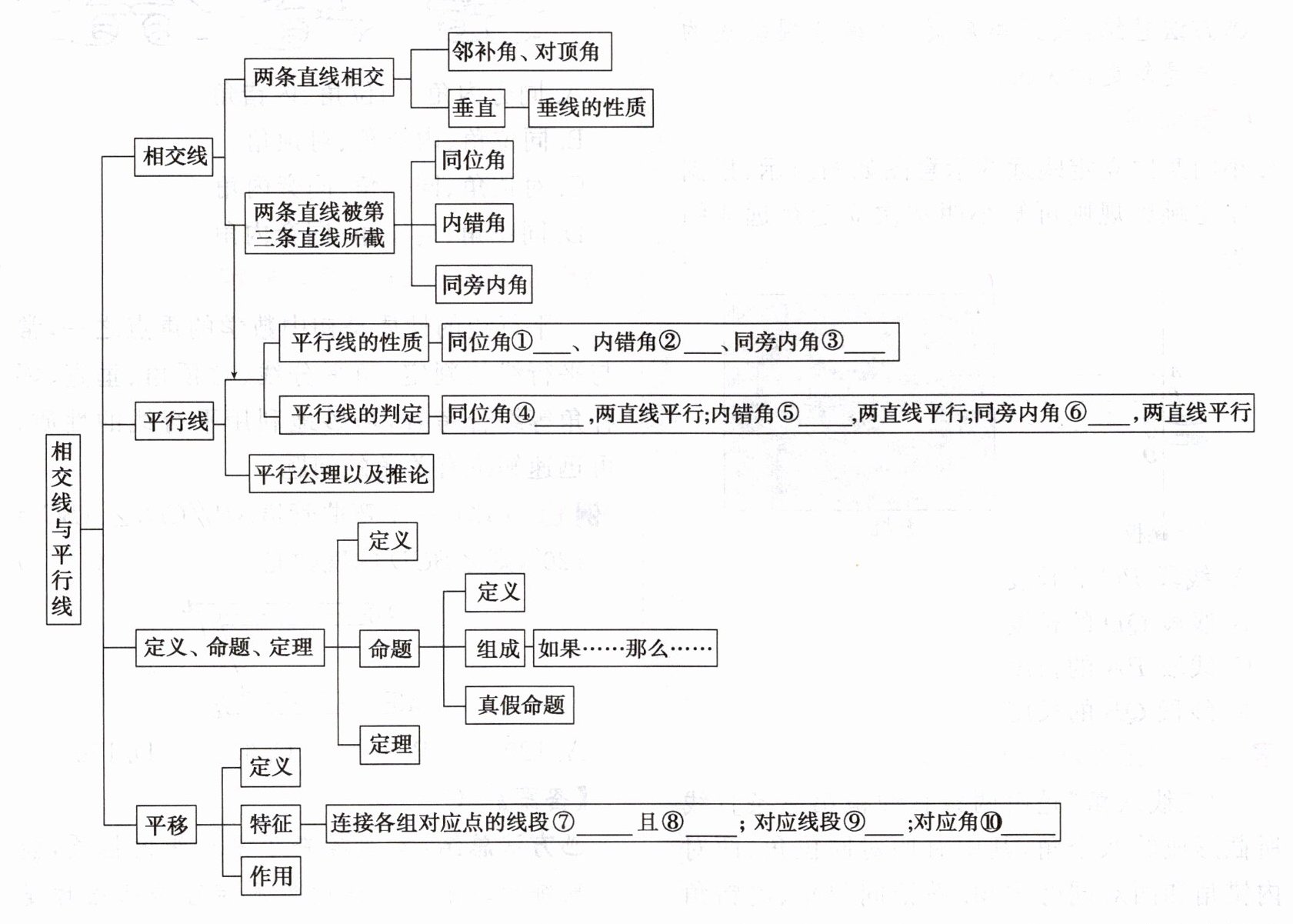 ①相等 ②相等 ③互补 ④相等 ⑤相等 ⑥互补 ⑦平行(或在同一条直线上) ⑧相等 ⑨平行(或在同一条直线上)且相等 ⑩相等