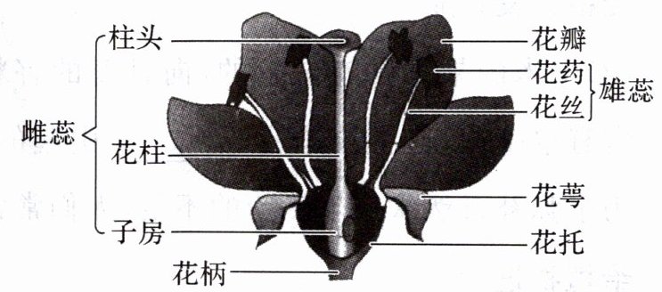 (1)桃花是由花柄、花托、花萼、花瓣、雄蕊和雌蕊等构成的。花的主要结构是