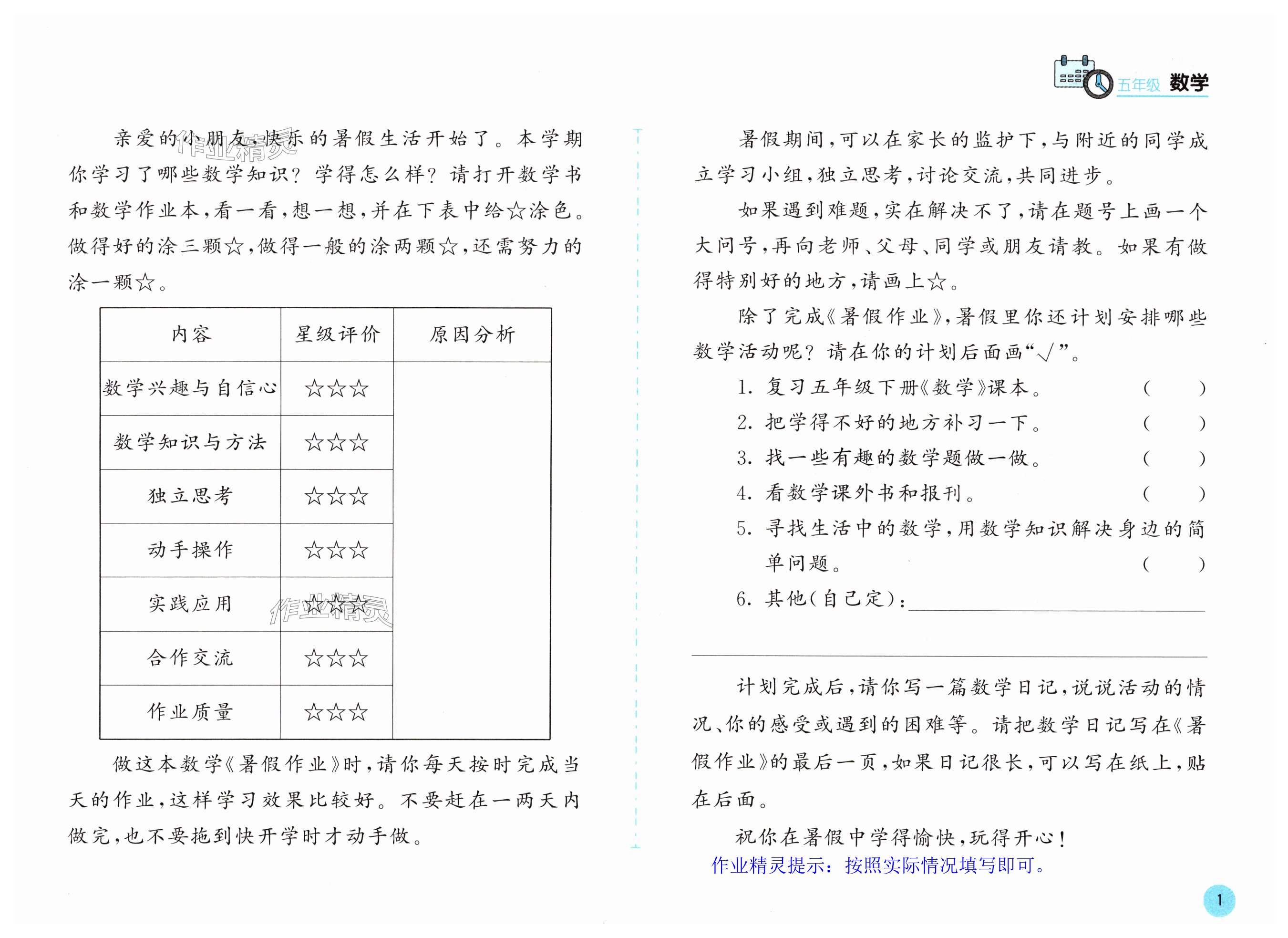 2025年暑假作业五年级数学人教版安徽少年儿童出版社