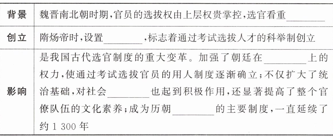 答案: 门第 进士科 选官 阶层流动 选拔官员