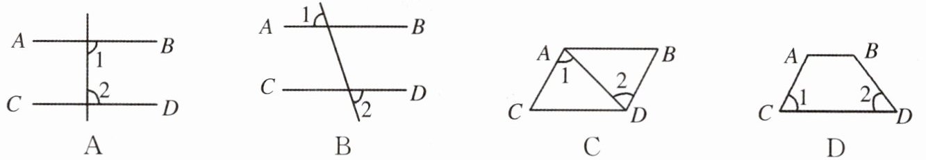 2. 下列图形中,由$AB// CD$,能得到$∠1=∠2$的是 (