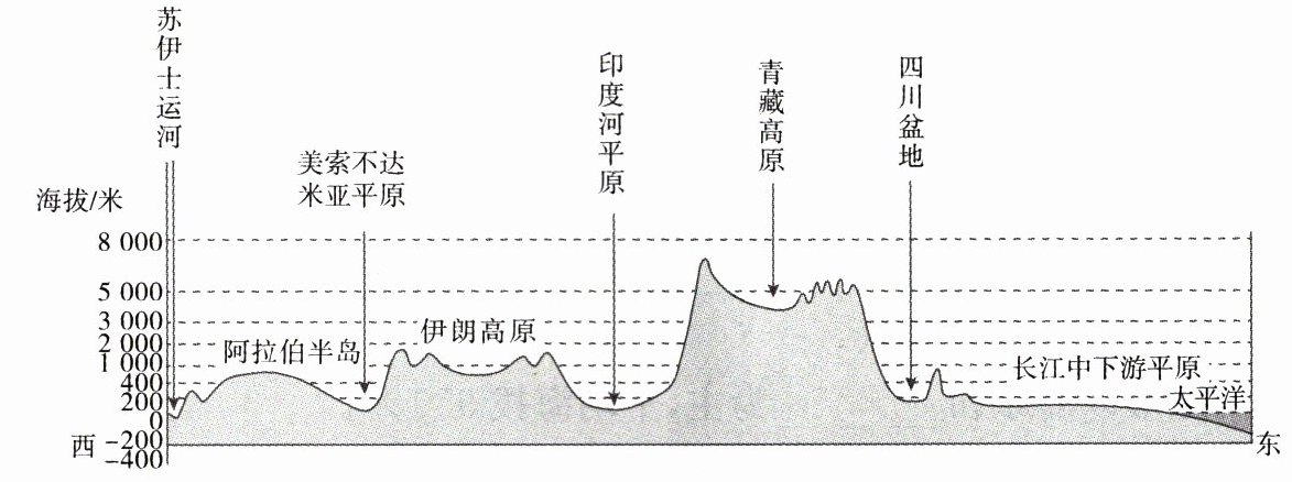 亚洲自然环境复杂多样,下图为亚洲大陆沿30°N纬线的地形剖面示意图。读图,完成2~3题。
