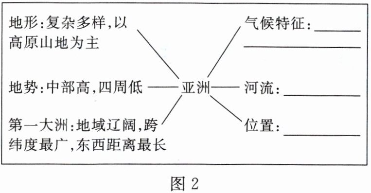 (新考法·思维导图)主题班会课上,几位同学正在讨论我们生活的亚洲。读小芳同学所画的思维导图(图2),完成4~6题。