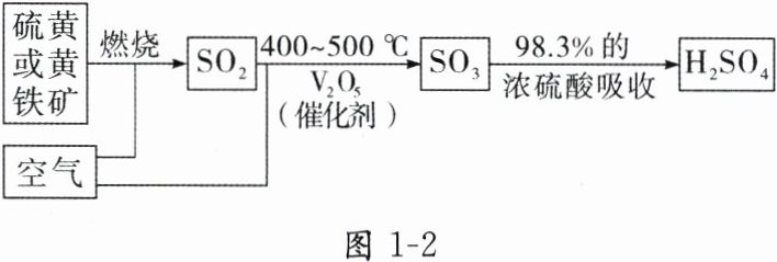 或$4FeS_{2}+11O_{2}\overset{高温}{\xlongequal{\;\;}}2Fe_{2}O_{3}+8SO_{2}$,$ 2SO_2 + O_2 \xlongequal[V_2O_5]{400 \sim 500^{\circ}C} 2SO_3 $