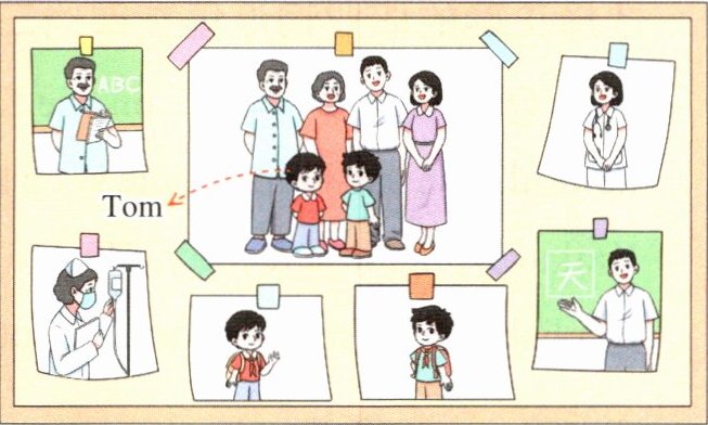 1. × 【点拨】句意为:汤姆有一个小家庭。观察展示板可知汤姆有一个大家庭。句意与图片不符,故填“×”。2. √ 【点拨】句意为:汤姆和他的哥哥是学生。观察展示板可知句意与图片相符,故填“√”。3. √ 【点拨】句意为:汤姆的母亲是一名医生。观察展示板可知句意与图片相符,故填“√”。4. × 【点拨】句意为:汤姆的父亲和祖母是教师。观察展示板可知汤姆的父亲是一名教师,祖母是一名护士。句意与图片不符,故填“×”。