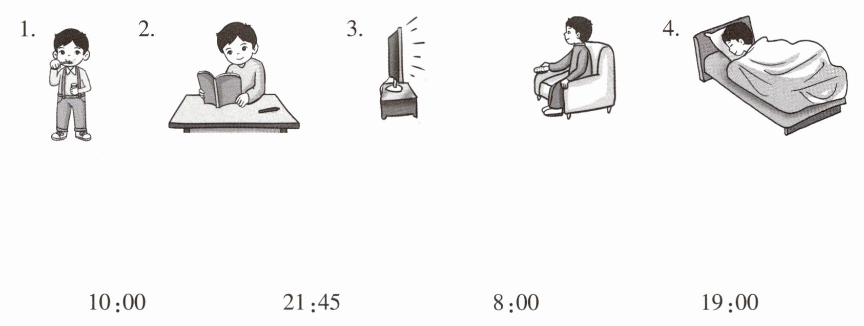 1—8:00 2—10:00 3—19:00 4—21:45