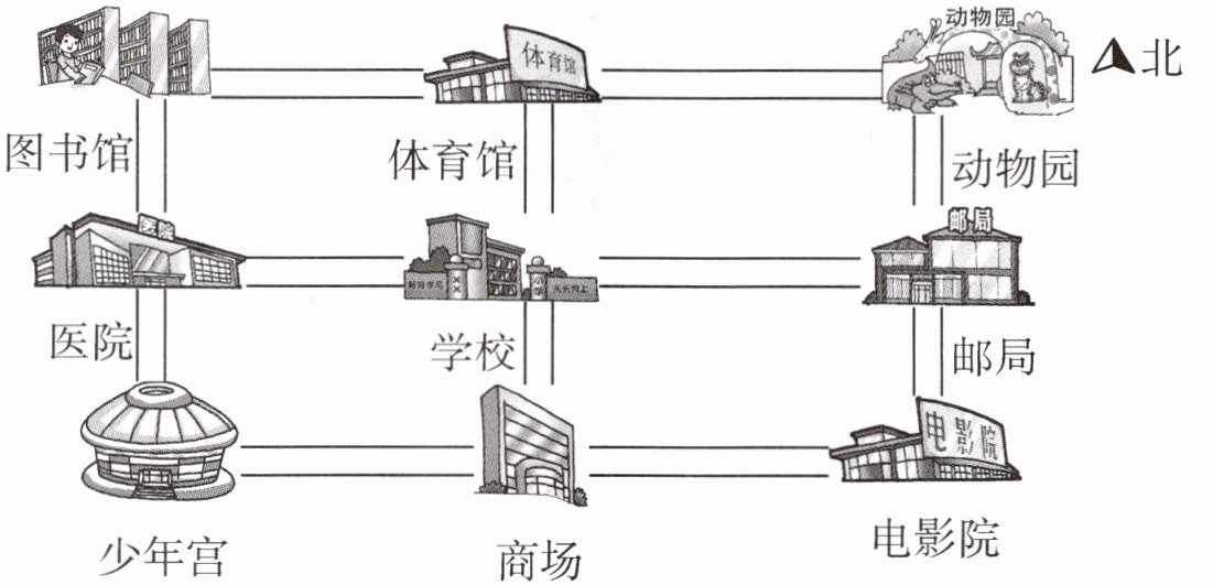 (3)从少年宫出发,向( )走到医院,再向( )走到学校。
