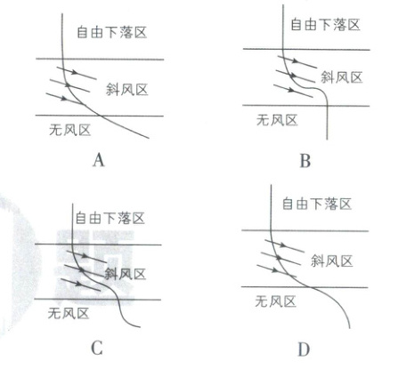 4. [广东广州2025高一下月考]“细雨斜风作晓寒,淡烟疏柳媚晴滩”是宋代文学家苏轼描写早春游山时的沿途景观.有一雨滴从静止开始自由下落一段时间后,进入如图所示的斜风区域并下落一段时间,然后又进入无风区继续运动直至落地,若雨滴受到的阻力可忽略不计,则下列图中最接近雨滴真实运动轨迹的是(