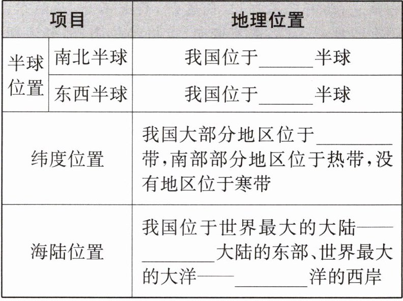 (1)疆域辽阔:南北跨纬度近 50°,因而产生了南北气候差异;东西跨经度超过 60°,因而产生了东西时间差异。