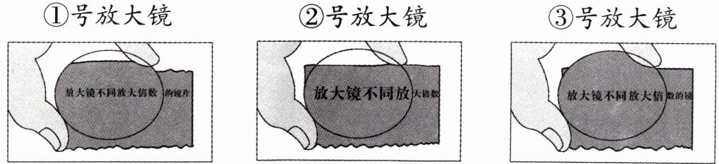 观察现象:上面 3 个放大镜中,凸度最大的是______号,放大倍数最大的是______号,视野最大的是______号。(均填序号)