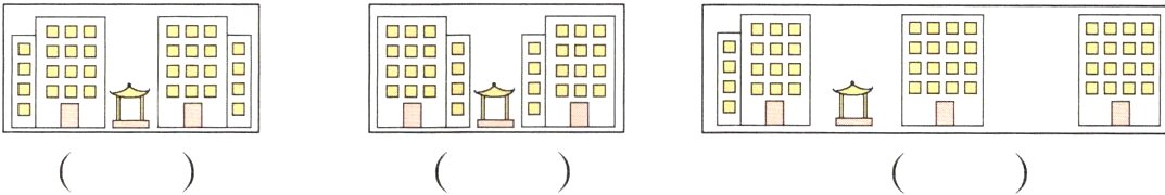 贝贝在西门、南门、东门各拍了一张照片。认真观察,下面三张照片各是从哪个门拍的?