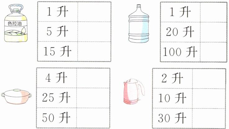 2.(生活体验)下面容器的容量各是多少升?在合适答案的右面画“√”。
