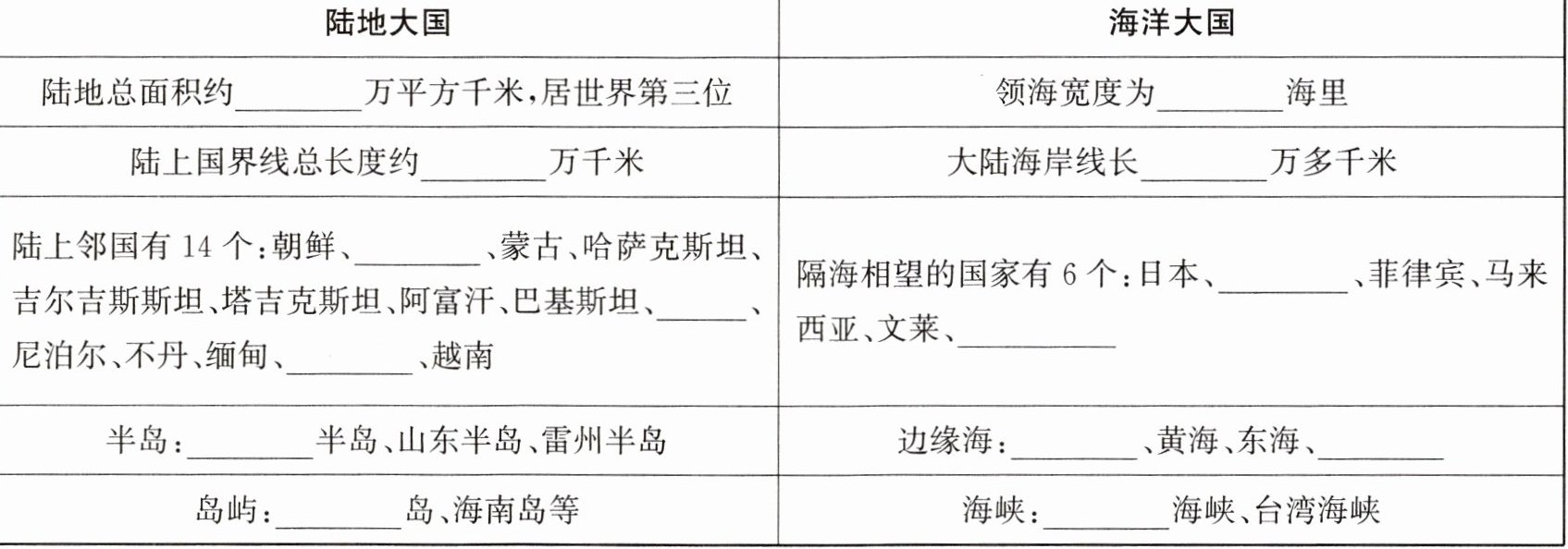 | 半岛:辽东半岛、山东半岛、雷州半岛 | 边缘海:渤海、黄海、东海、南海 |