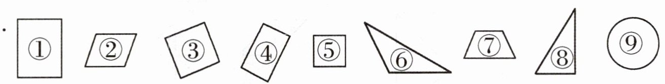 答案:①④是长方形,③⑤是正方形,⑥⑧是三角形,⑨是圆,②⑦是平行四边形。