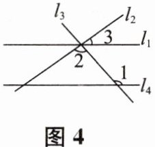 7. 如图4,直线$ l_{1} $,$ l_{2} $,$ l_{3} $交于一点,直线$ l_{4}// l_{1} $,若$ \angle 1=131^{\circ} $,$ \angle 2=95^{\circ} $,则$ \angle 3 $的度数为______