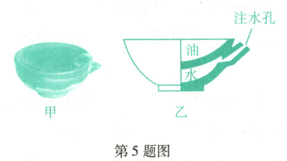 5. (沈阳市7中期中) 如图甲为我国古代的“节能灯”——“省油灯”, 图乙为其部分剖面示意图。向灯盏夹层内注水, 有助于减慢油的蒸发, 达到省油的目的。关于“省油灯”减慢油蒸发的方法, 下列说法正确的是(
