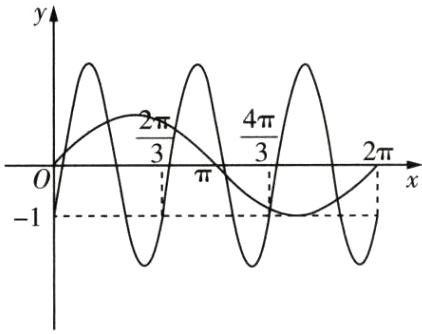 7.C 正弦函数的图象与性质(理性思维、数学探索) 数形结合法 因为函数$y = 2\sin(3x-\frac{\pi}{6})$的最小正周期$T=\frac{2\pi}{3}$,所以函数$y = 2\sin(3x-\frac{\pi}{6})$在$[0,2\pi]$上的图象恰好是三个周期的图象,(题眼)所以作出函数$y = 2\sin(3x-\frac{\pi}{6})$与$y = \sin x$在$[0,2\pi]$上的图象如图所示,