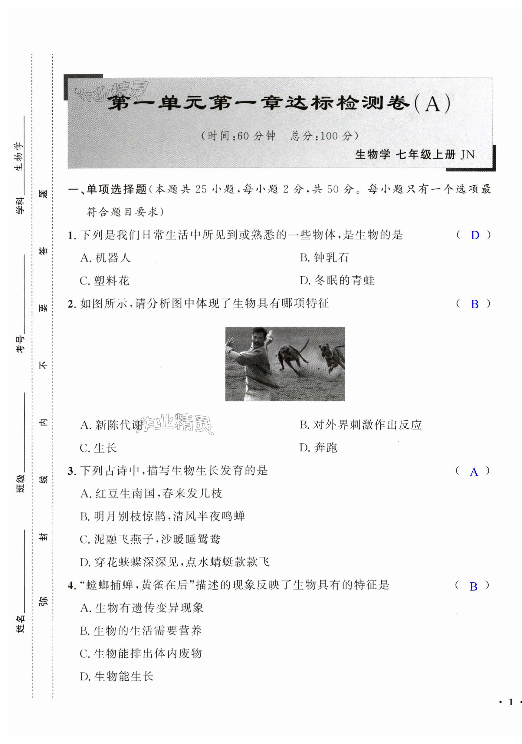 注:目前有些书本章节名称可能整理的还不是很完善,但都是按照顺序排列的,请同学们按照顺序仔细查找。练习册 2024年一课三练单元测试七年级生物上册济南版 答案主要是用来给同学们做完题方便对答案用的,请勿直接抄袭。