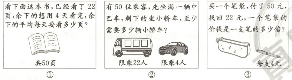 3. (毕节市黔西市·改编)下面三个问题能用$(50 - 22)÷4$解决的(
